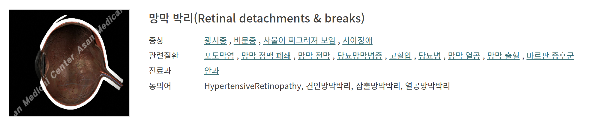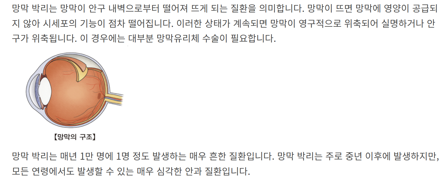 | 근시 | 고도근시는 망막이 얇아 위험 증가 |