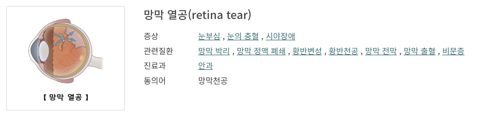 | 눈 외상 | 강한 충격이 망막열공을 유발 |