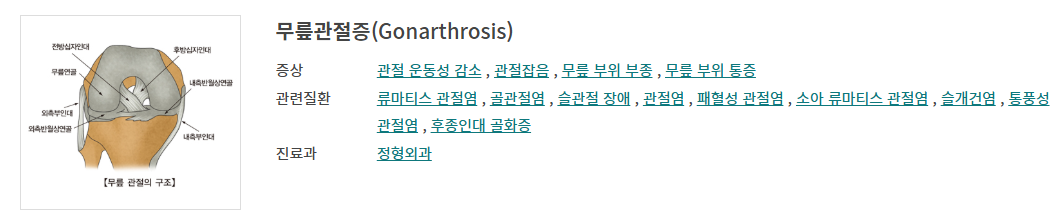 | 퇴행성 관절염 | 연골이 닳는 현상 | 아침에 뻣뻣, 걸을 때 통증 |