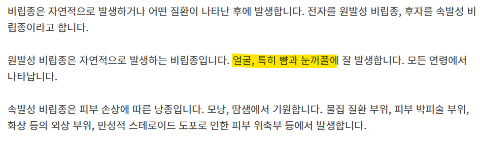 - 눈꺼풀, 눈가, 뺨 등 피부가 얇은 곳에 잘 발생