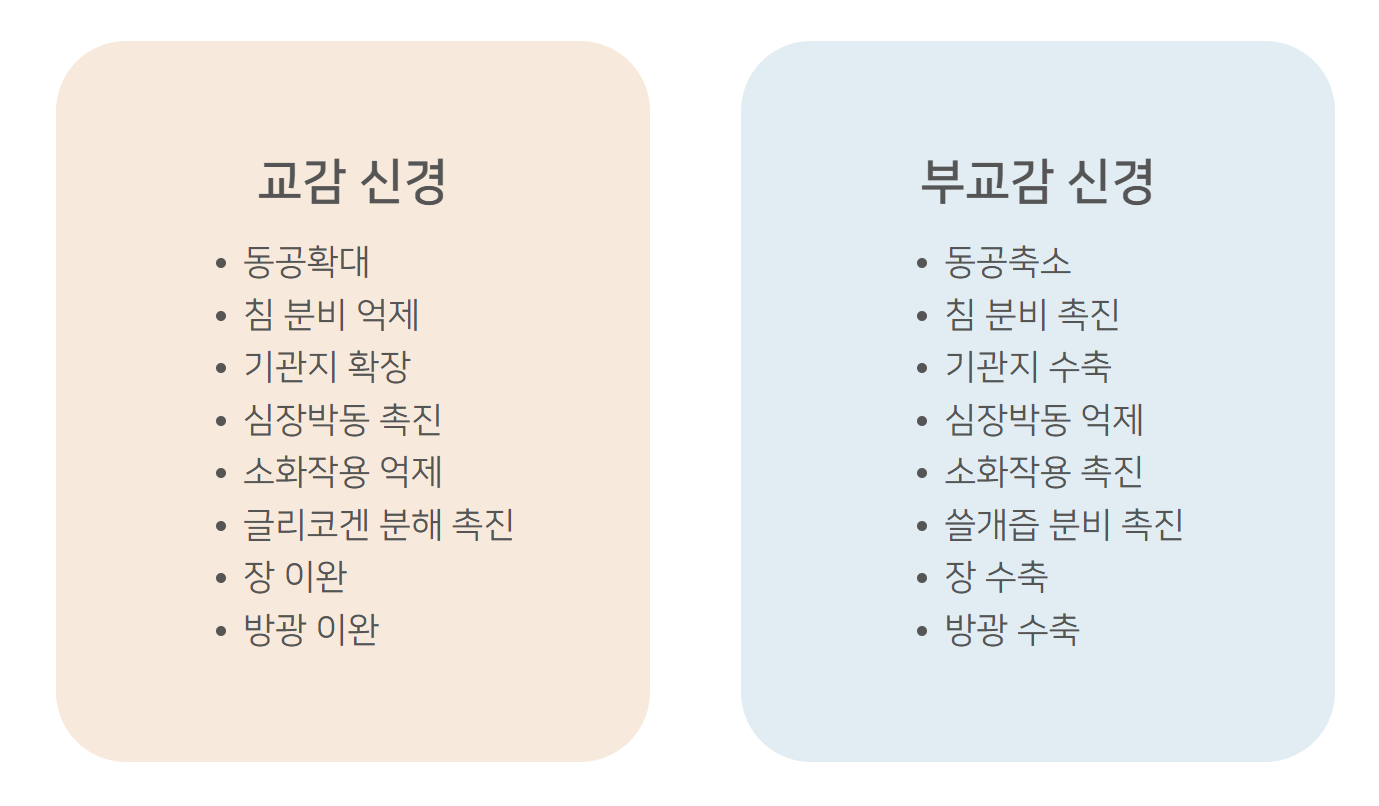 | 교감신경 | 긴장, 흥분, 스트레스 상태에서 활성화 (싸우거나 도망가기 반응) |