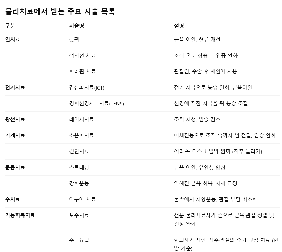 - 목적: 통증 완화, 기능 회복, 자세 교정