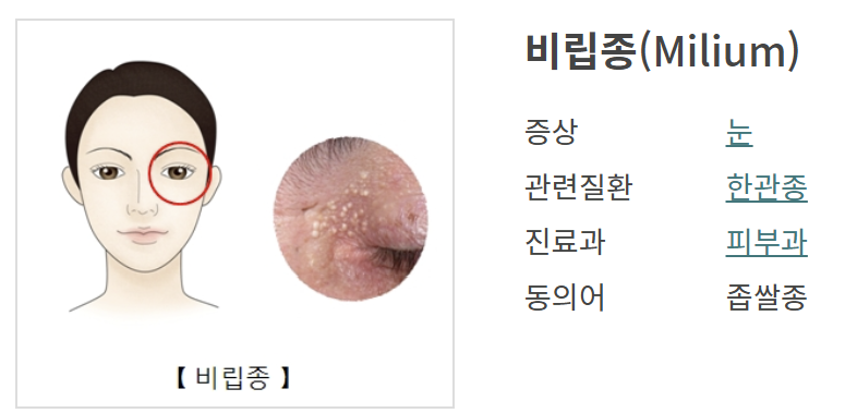 비립종은 피부에 생기는 작고 하얀 좁쌀처럼 보이는 피지 덩어리입니다.