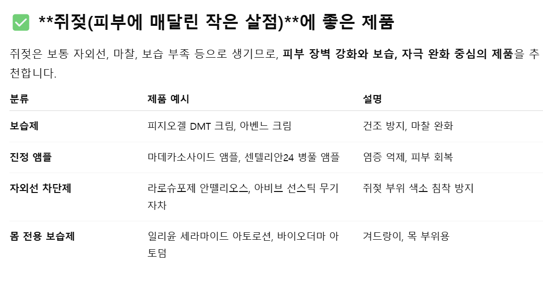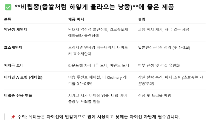 | 주기적 각질 제거 | 약산성 필링제, 효소 세안제 추천 |