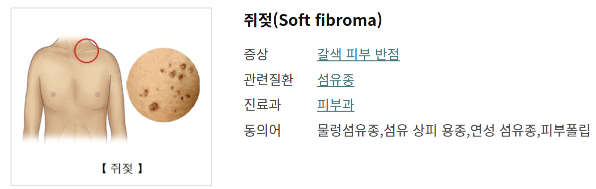 쥐젖은 의학적으로는 연성 섬유종이라고 하며, 피부에 작은 살점이 돌출되는 형태로 생깁니다.