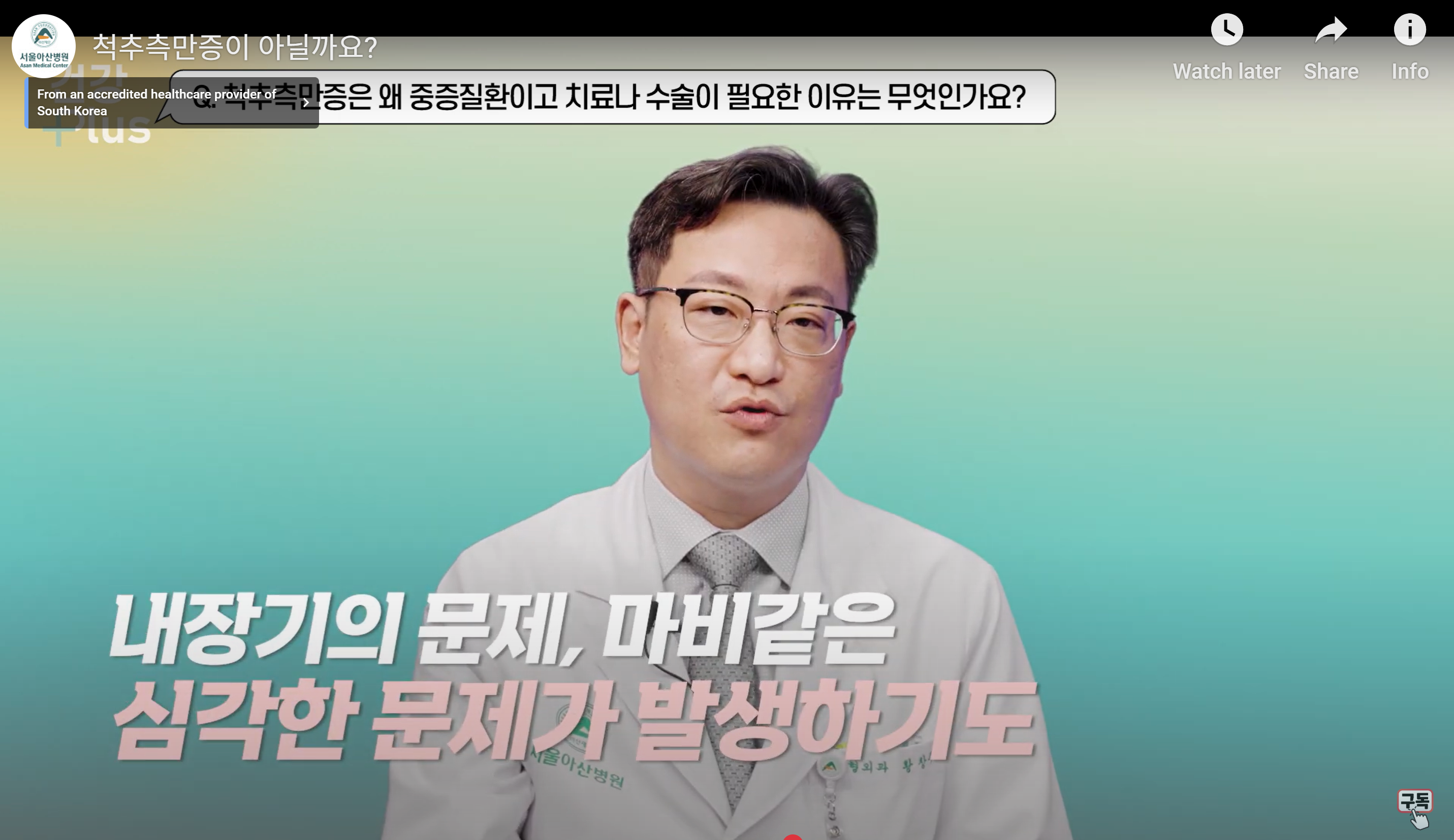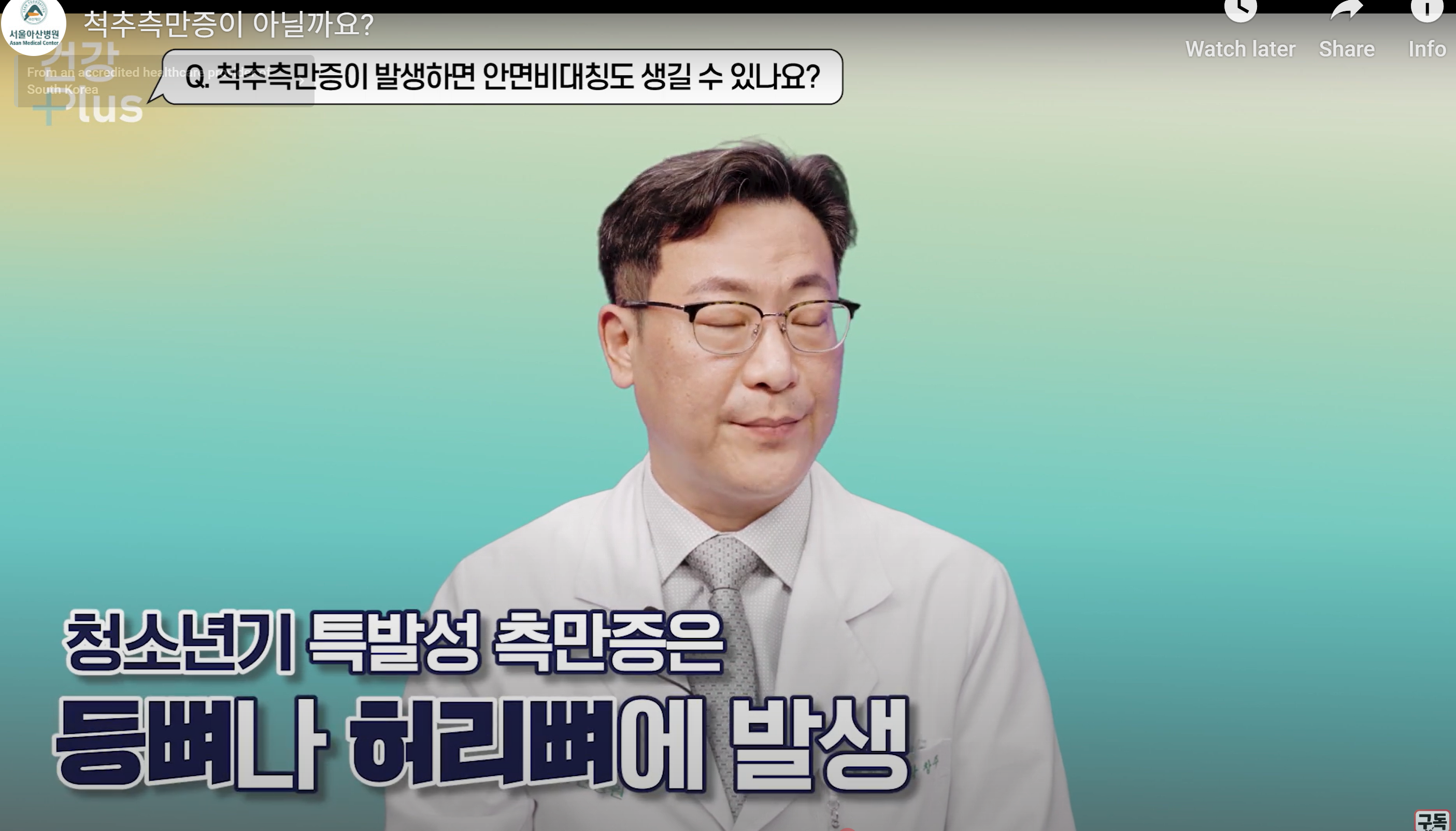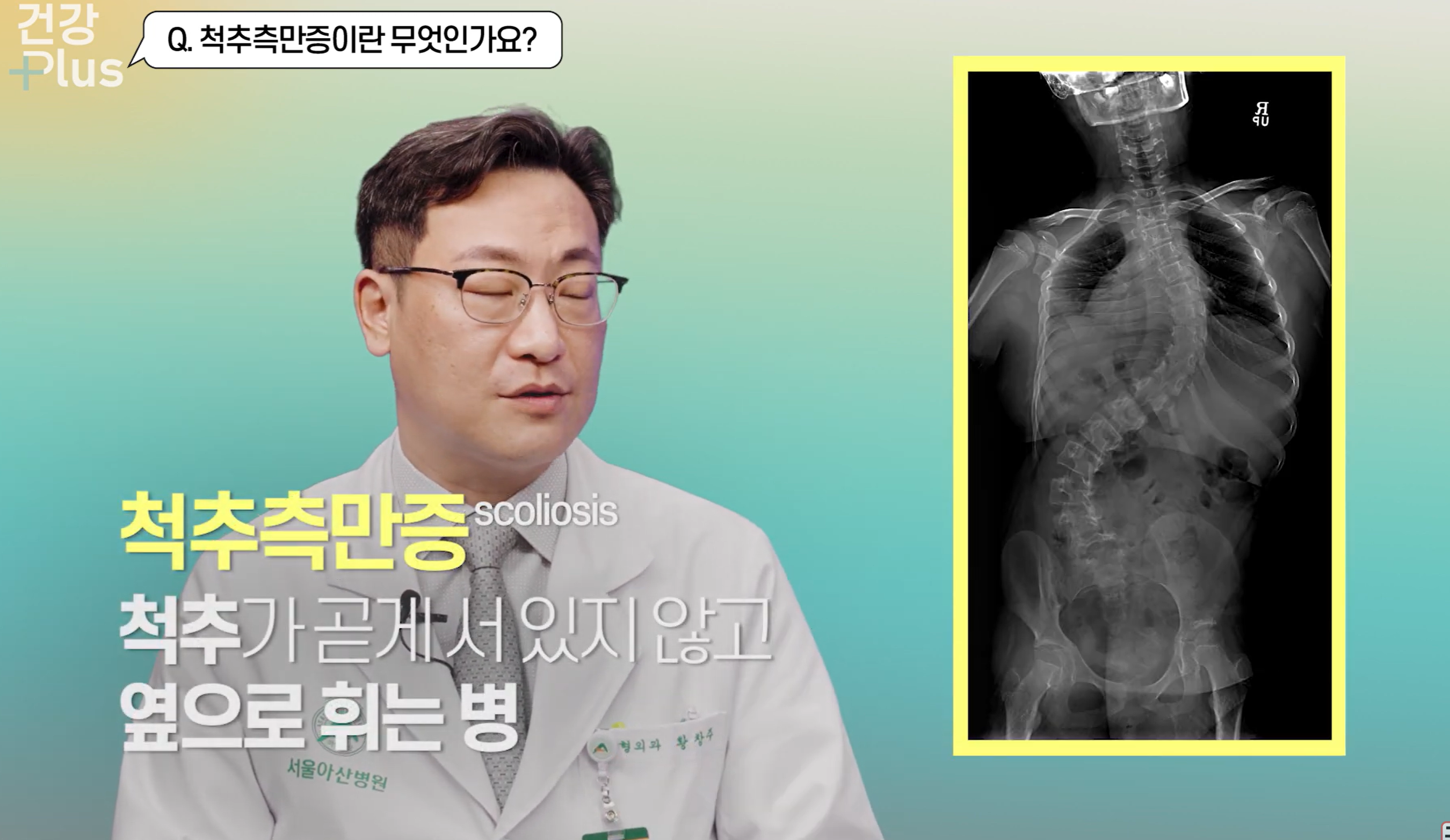 척추측만증은 척추가 정면에서 보았을 때 S자 또는 C자 형태로 비정상적으로 휘는 질환입니다.