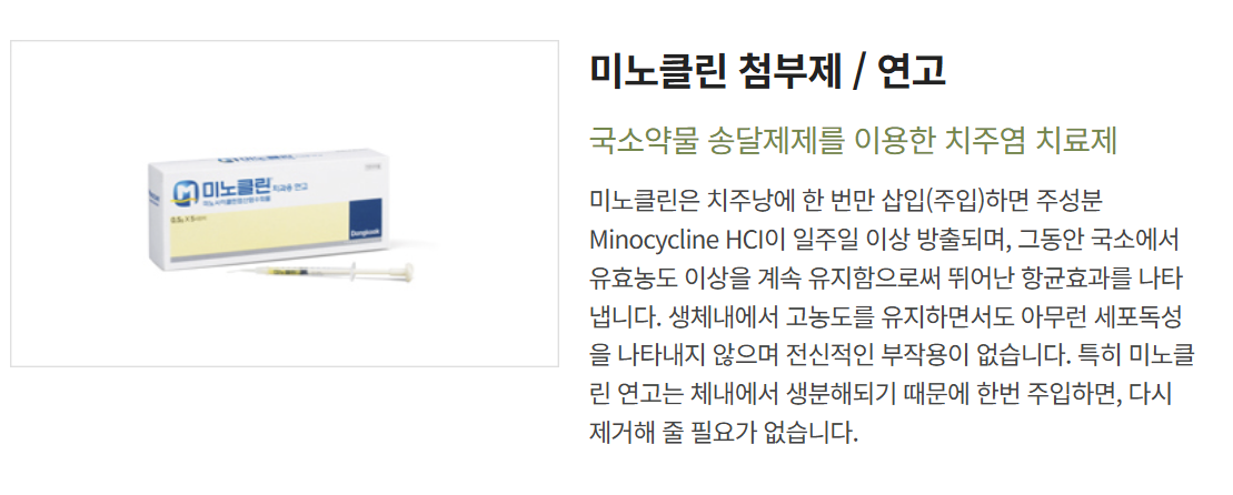 | 미노덴 | 미노사이클린 (항생제) | 치주염 등 국소 항염 효과 | 1만~2만 원 | 잇몸 깊은 부위까지 도포 가능, 전문의 상담 권장 |