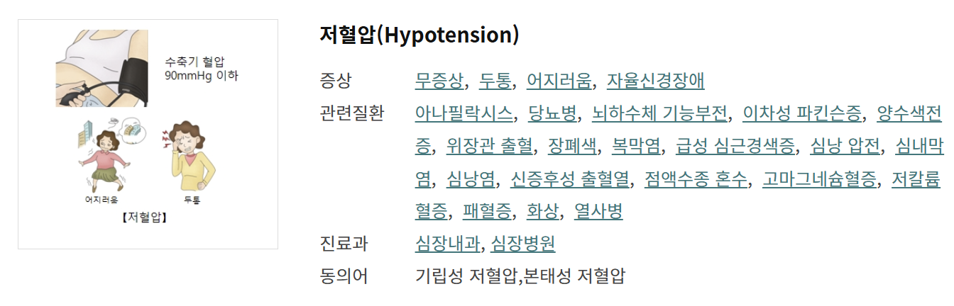 - 급성 저혈압: 출혈, 감염, 심장 문제 등으로 갑자기 혈압이 떨어지는 상태로, 응급상황이 될 수 있습니다.