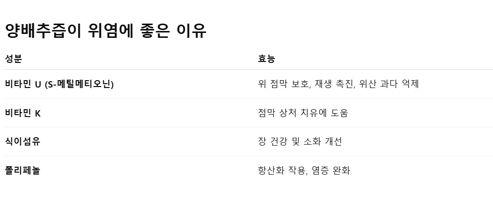 양배추즙은 위 점막을 회복시키고 위산을 조절해 위염 완화에 도움을 주는 대표적인 자연 치료식품입니다.